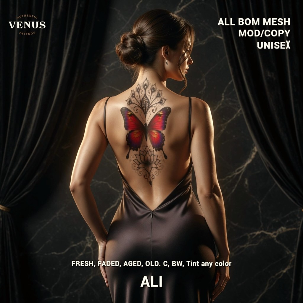 A bold, full-back butterfly masterpiece. Rich crimson-to-violet gradients burst across intricate mandala wings, framed by delicate black filigree that flows seamlessly into a lower lotus bloom.